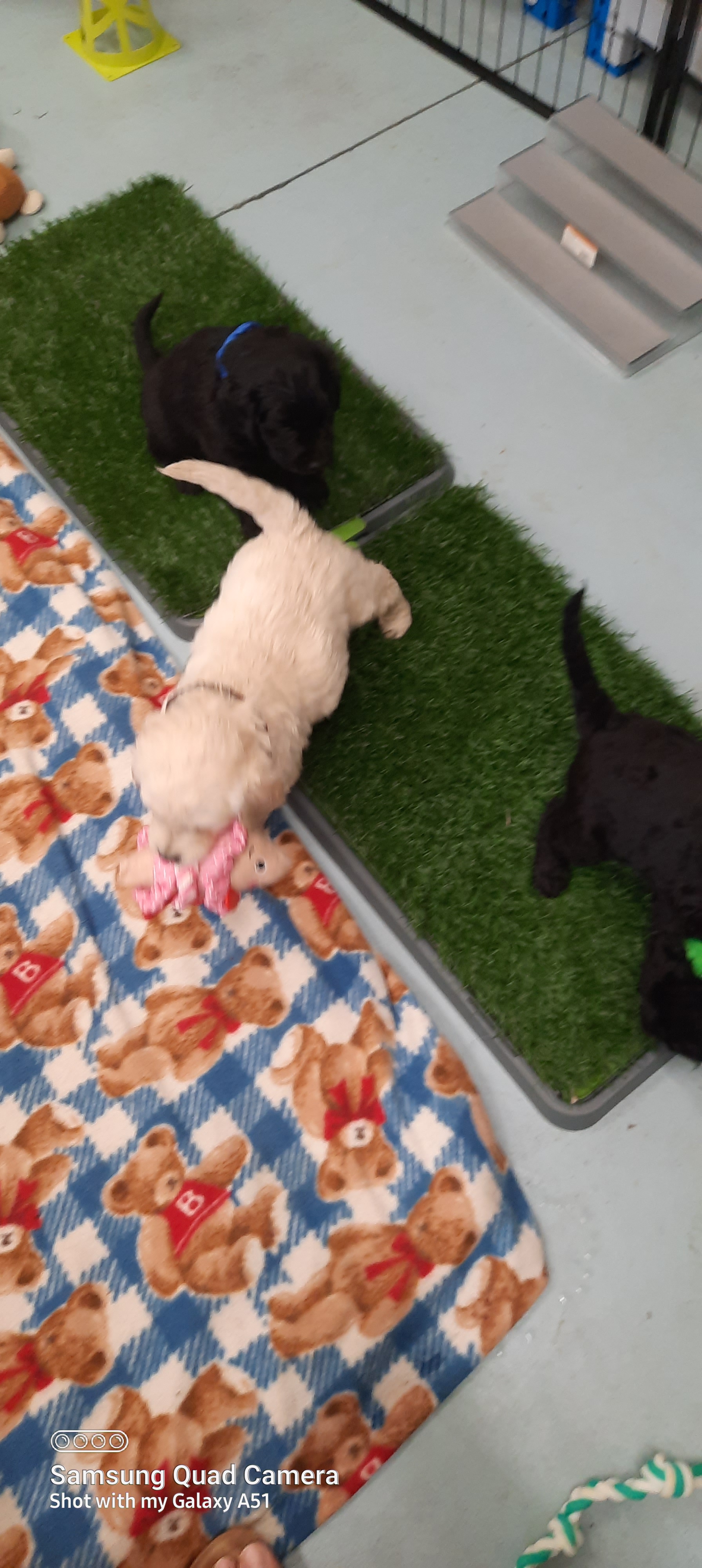 - Litterbox and potty training- we teach our puppies to utilize a artificial grass toilet station when inside and to take themselves outside to grass areas to potty. Note if you intend to utilize a different inside toilet system (such as a litter box please inform us of this as soon as possible so that we can get your chosen puppy acclimatized to associating this material with a toilet station rather than a play surface. We do take care to ensure the pups also understand the difference between the artificial turf used for their toilet station and the different textured astroturf used on dog play equipment.